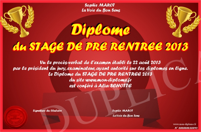 Envoyez par email votre Diplôme du STAGE DE PRE RENTREE 2013 personalisé