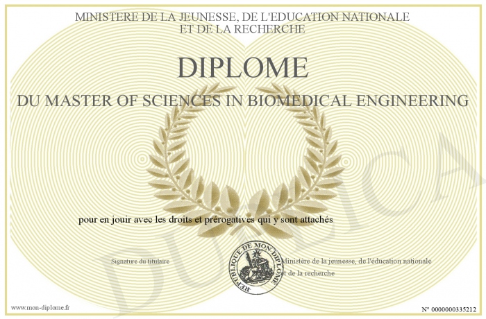 Envoyez par email votre Diplôme du Master of Sciences in Biomedical Engineering personalisé