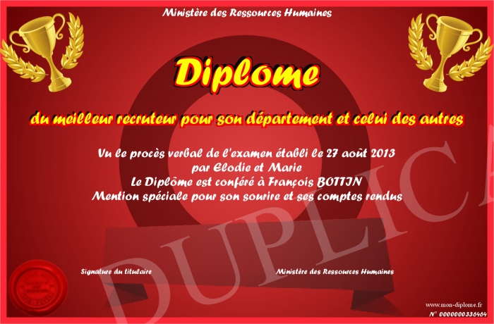 Envoyez par email votre Diplôme du meilleur recruteur pour son département et celui des autres personalisé