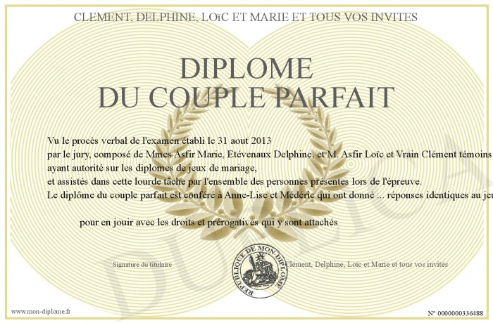 Envoyez par email votre Diplôme du couple parfait personalisé