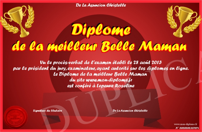 Envoyez par email votre Diplôme de la meilleur Belle Maman personalisé