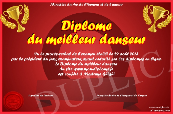 Envoyez par email votre Diplome du meilleur danseur personalisé