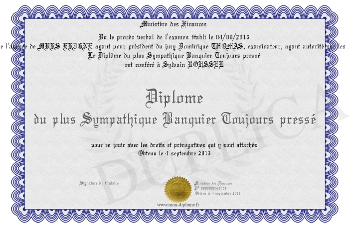Envoyez par email votre Diplôme du plus Sympathique Banquier Toujours pressé personalisé