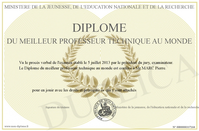 Envoyez par email votre Diplôme du meilleur professeur technique au monde personalisé