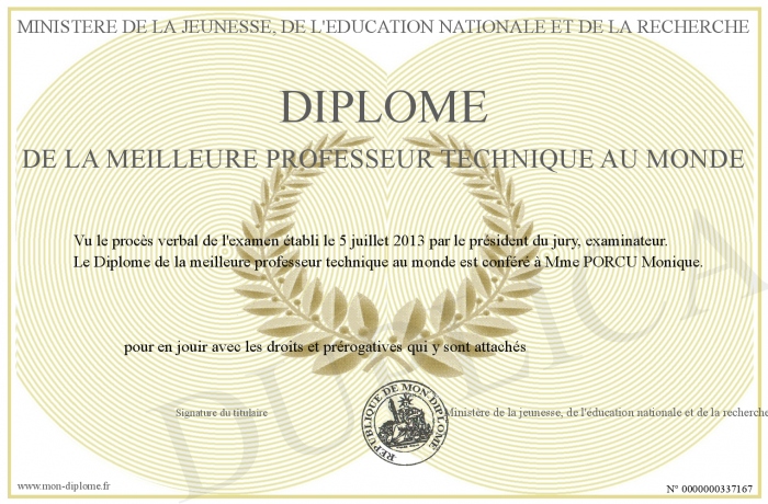 Envoyez par email votre Diplôme de la meilleure professeur technique au monde personalisé