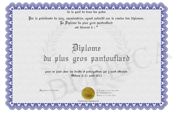 Envoyez par email votre Diplôme du plus gros pantouflard personalisé