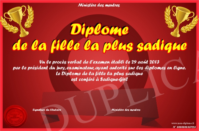 Envoyez par email votre Diplome de la fille la plus sadique personalisé