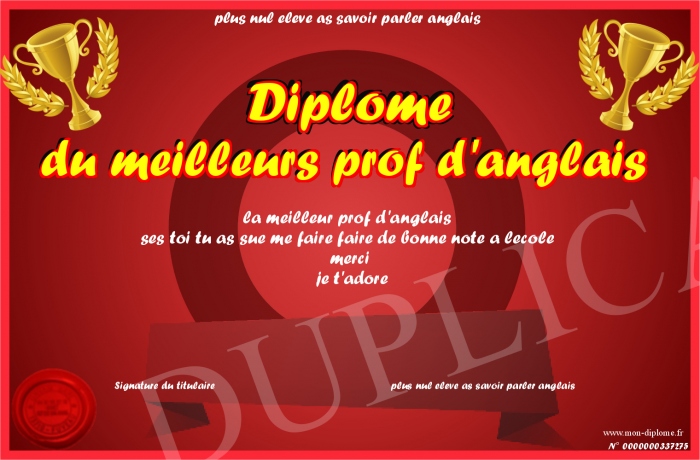 Envoyez par email votre Diplôme du meilleurs prof d'anglais personalisé