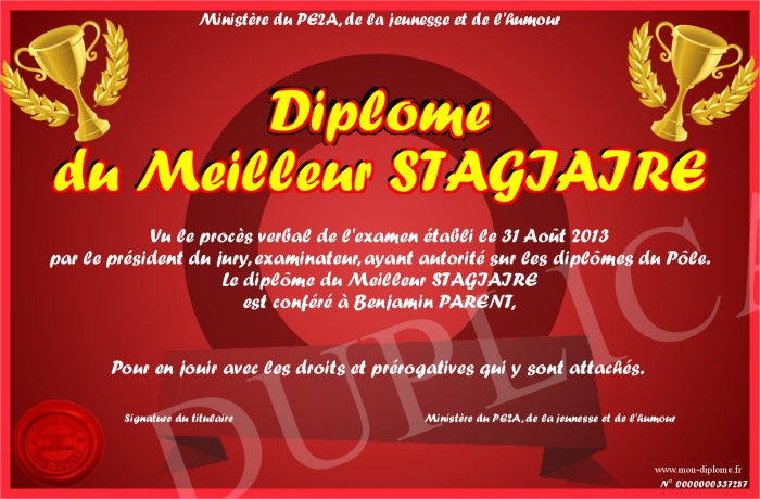 Envoyez par email votre Diplôme du Meilleur STAGIAIRE personalisé