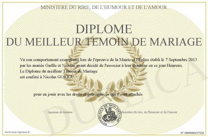 Envoyez par email votre Diplôme du meilleur Témoin de Mariage personalisé