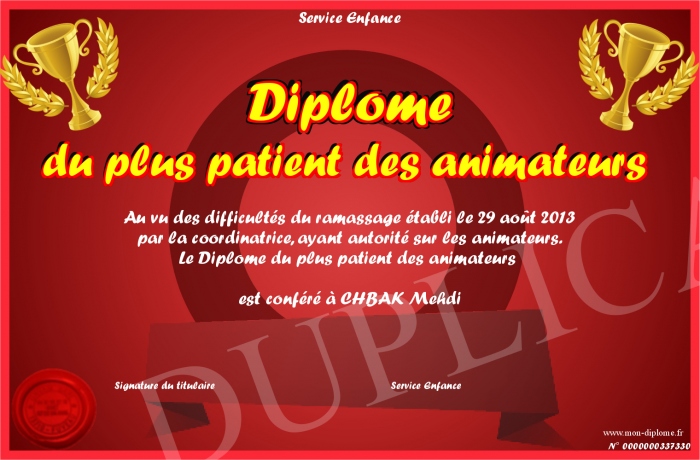 Envoyez par email votre Diplôme du plus patient des animateurs personalisé