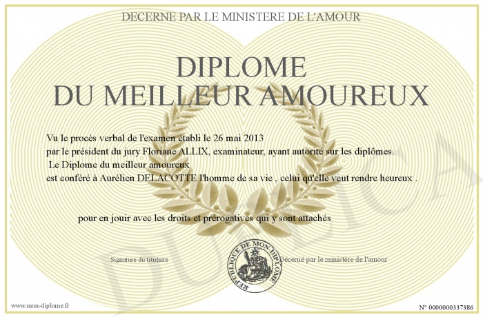 Envoyez par email votre Diplôme du meilleur amoureux personalisé