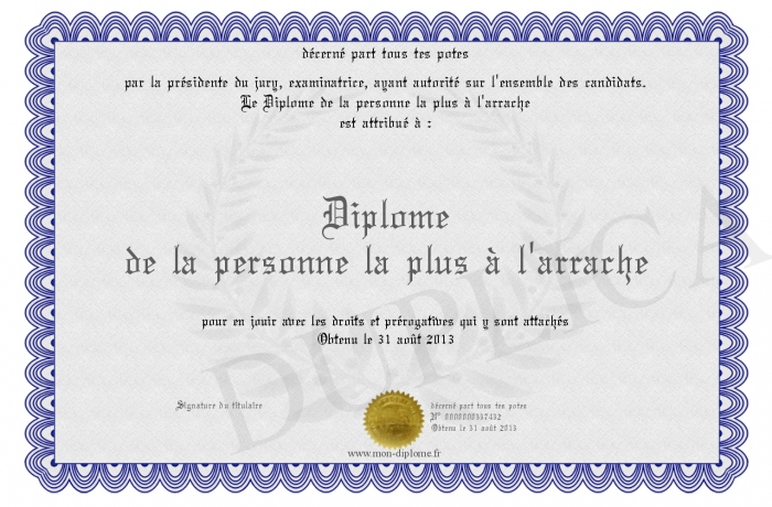 Envoyez par email votre Diplôme de la personne la plus à l'arrache personalisé