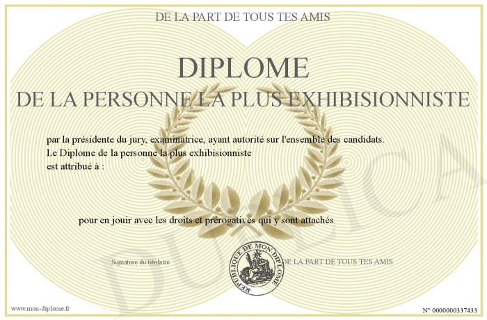 Envoyez par email votre Diplôme de la personne la plus exhibisionniste personalisé