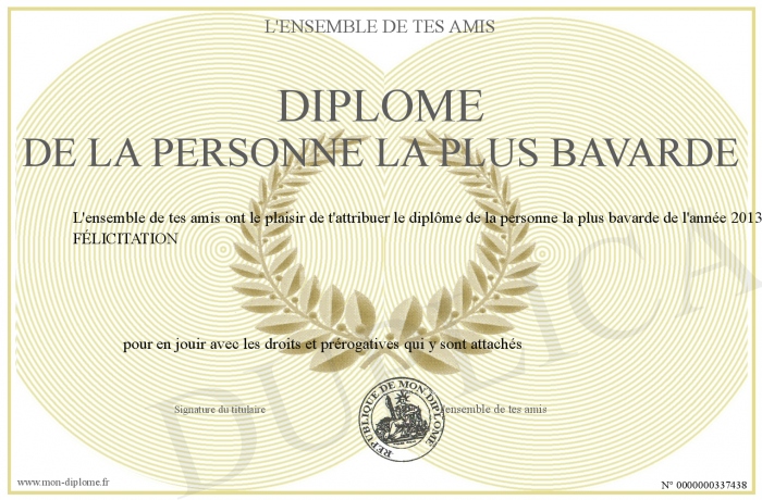 Envoyez par email votre Diplôme de la personne la plus bavarde personalisé