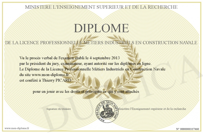 Envoyez par email votre Diplôme de la Licence Professionnelle Métiers Industriels en Construction Navale personalisé