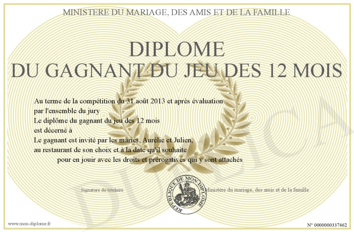 Envoyez par email votre Diplôme du gagnant du jeu des 12 mois personalisé