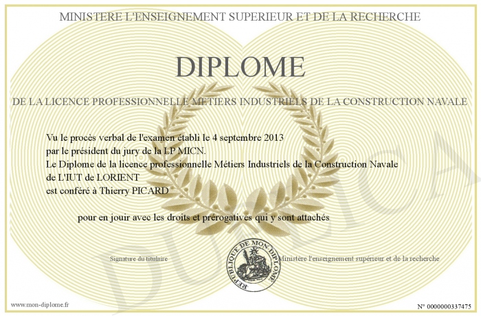 Envoyez par email votre Diplôme de la licence professionnelle Métiers Industriels de la Construction Navale personalisé