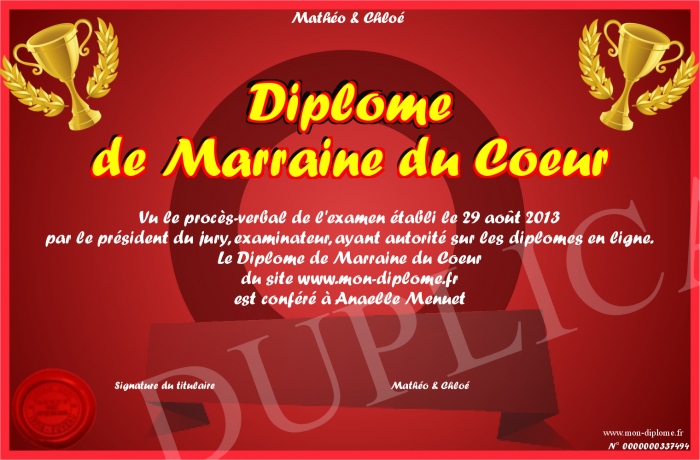 Envoyez par email votre Diplôme de Marraine du Coeur personalisé