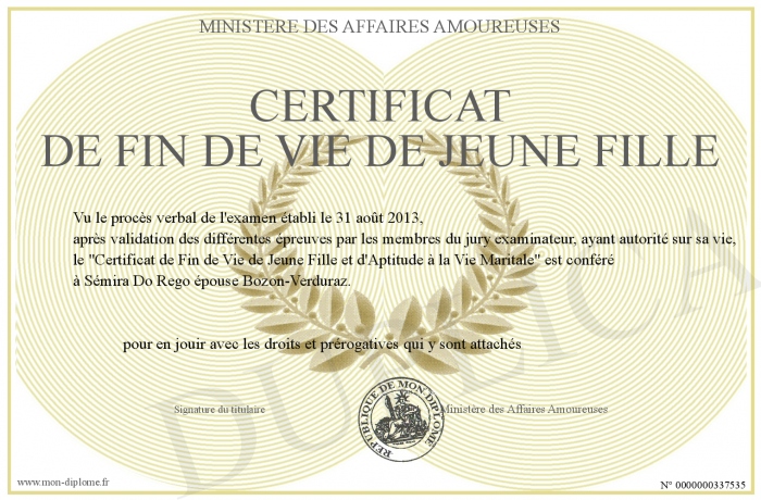Envoyez par email votre Certificat de Fin de Vie de Jeune Fille personalisé