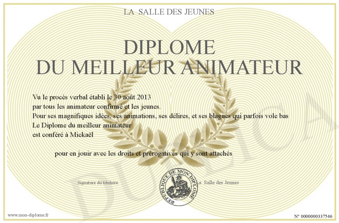 Envoyez par email votre Diplôme du meilleur animateur personalisé