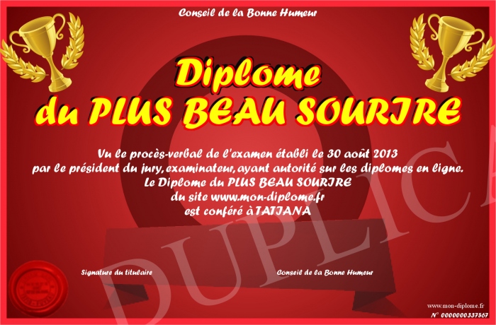 Envoyez par email votre Diplôme du PLUS BEAU SOURIRE personalisé