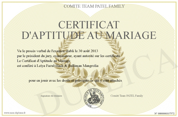 Envoyez par email votre Certificat d'Aptitude au Mariage personalisé