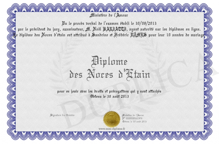 Envoyez par email votre Diplôme des Noces d'Etain personalisé
