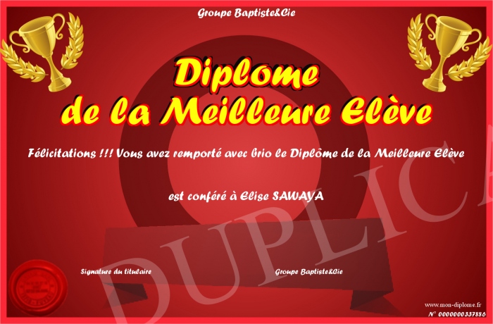 Envoyez par email votre Diplôme de la Meilleure Elève personalisé