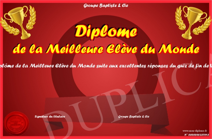 Envoyez par email votre Diplôme de la Meilleure Elève du Monde personalisé