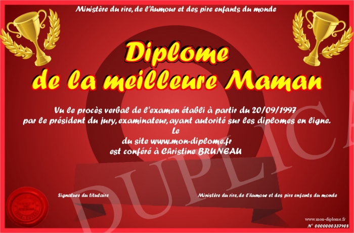 Envoyez par email votre Diplome de la meilleure Maman personalisé