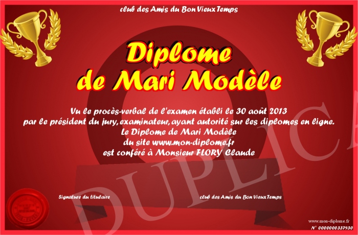 Envoyez par email votre Diplôme de Mari Modèle personalisé