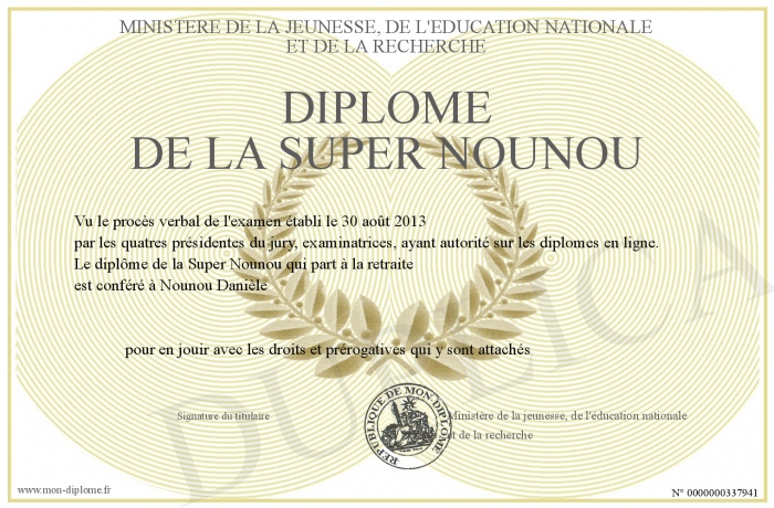 Envoyez par email votre Diplôme de la Super Nounou personalisé