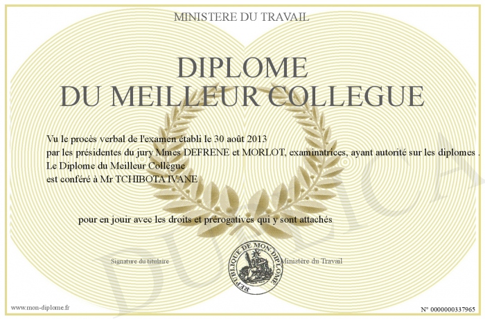 Envoyez par email votre Diplôme du Meilleur Collègue personalisé