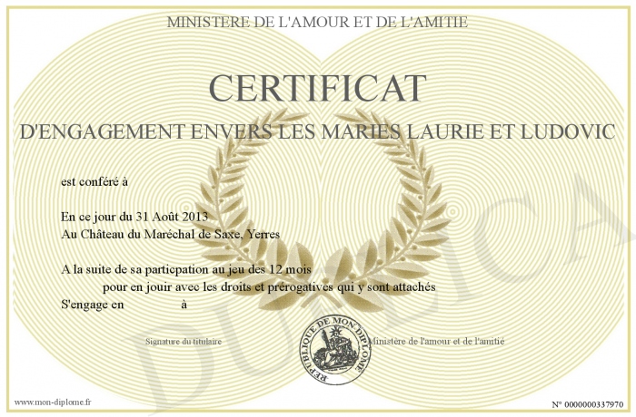 Envoyez par email votre Certificat d'engagement envers les Mariés Laurie et Ludovic personalisé