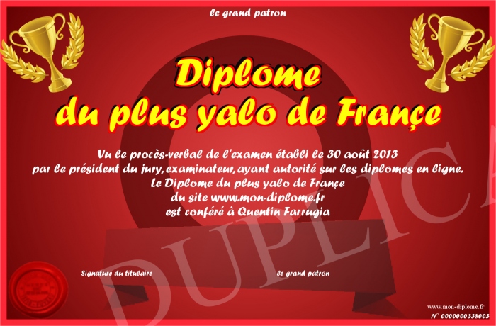 Envoyez par email votre Diplome du plus yalo de Françe personalisé