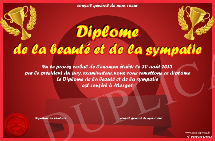 Envoyez par email votre Diplôme de la beauté et de la sympatie personalisé