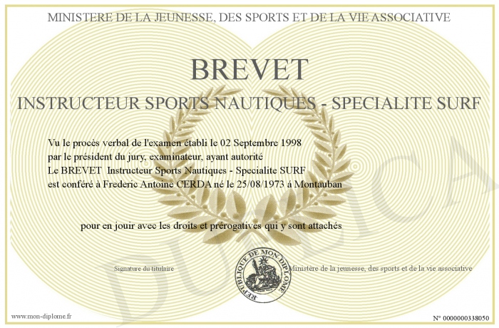 Envoyez par email votre BREVET Instructeur Sports Nautiques - Specialite SURF personalisé