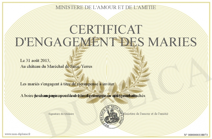 Envoyez par email votre CERTIFICAT D'ENGAGEMENT DES MARIES personalisé