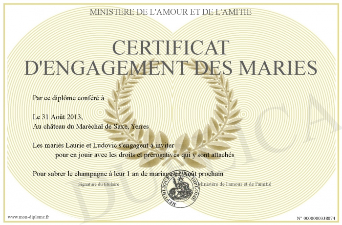 Envoyez par email votre Certificat d'engagement des mariés personalisé