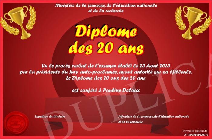 Envoyez par email votre Diplôme des 20 ans personalisé