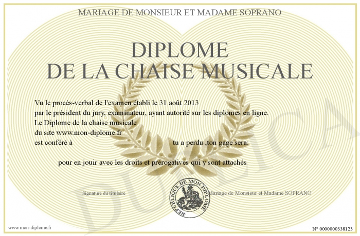 Envoyez par email votre Diplôme de la chaise musicale personalisé
