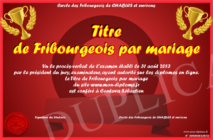 Envoyez par email votre Titre de Fribourgeois par mariage personalisé