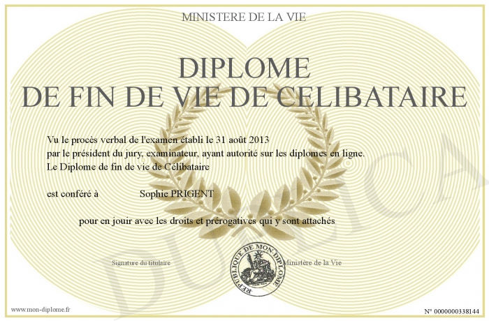 Envoyez par email votre Diplôme de fin de vie de Célibataire personalisé