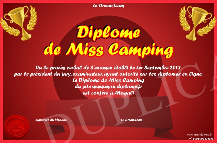 Envoyez par email votre Diplôme de Miss Camping personalisé