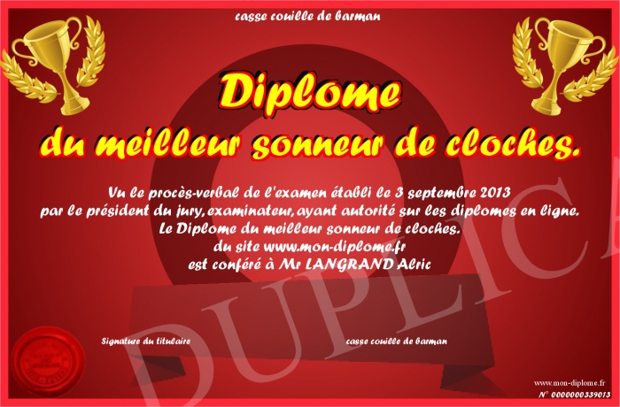 Envoyez par email votre Diplôme du meilleur sonneur de cloches. personalisé