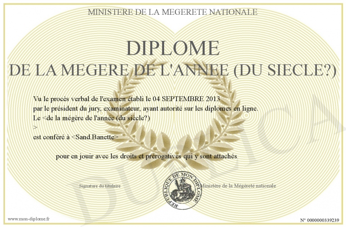 Envoyez par email votre Diplôme de la Mégère de l'année (du siècle?) personalisé