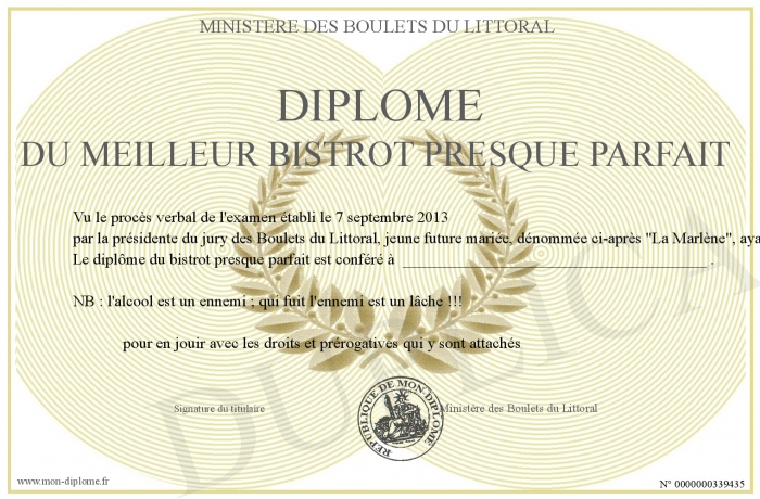 Envoyez par email votre Diplôme du meilleur bistrot presque parfait personalisé