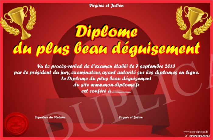 Envoyez par email votre Diplôme du plus beau déguisement personalisé