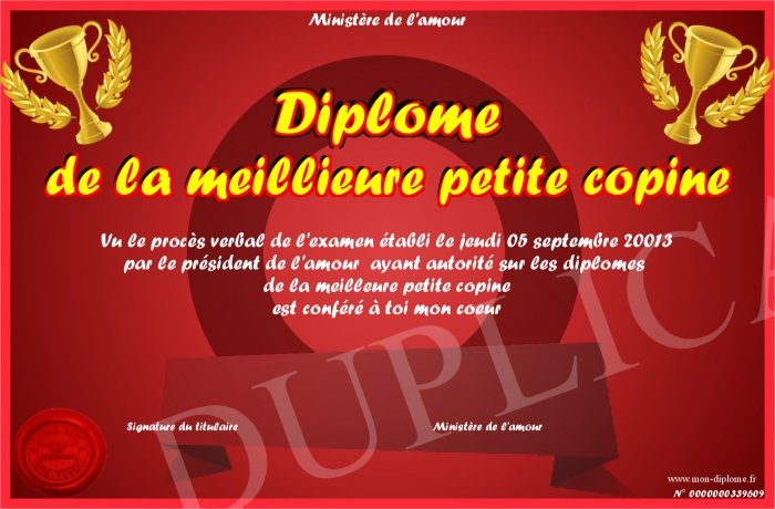 Envoyez par email votre Diplome de la meillieure petite copine personalisé